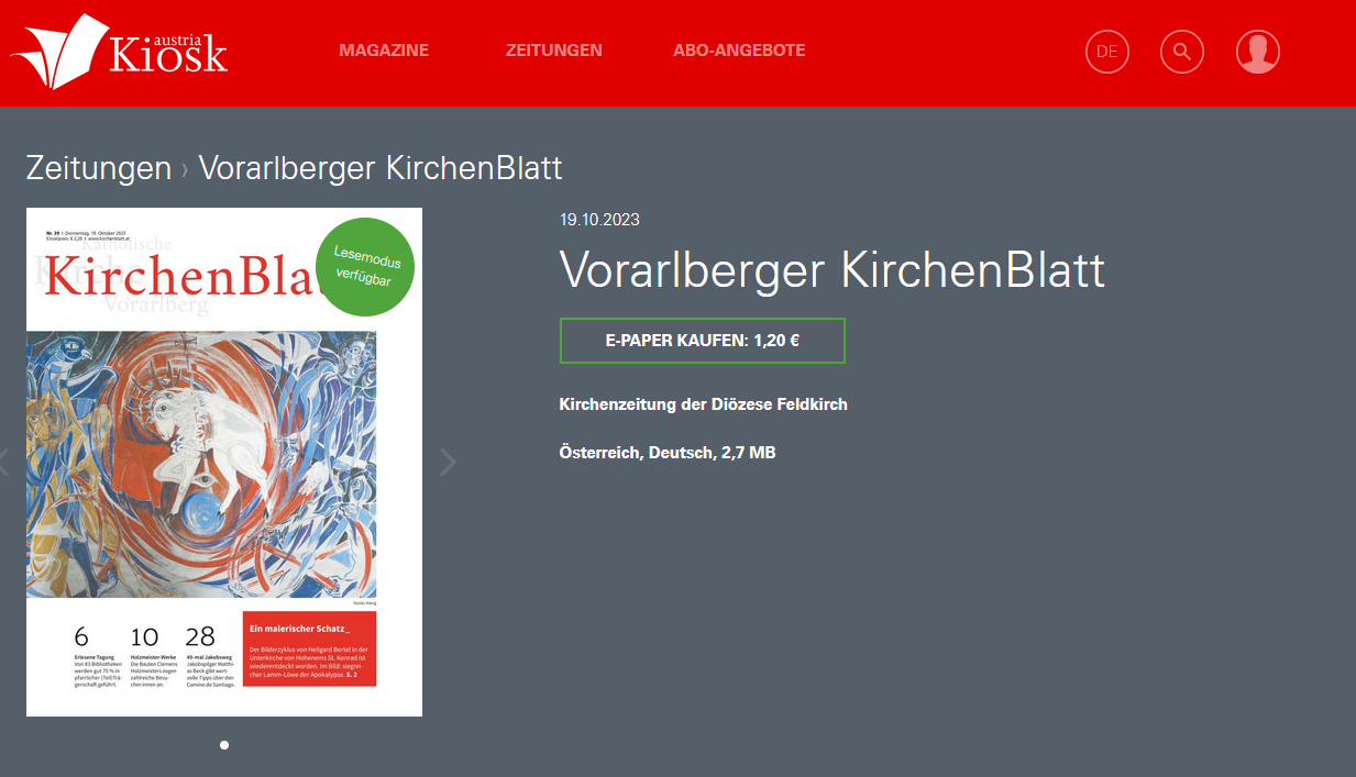 Das Vorarlberger KirchenBlatt ist über den Austria-Kiosk auch als E-Paper erhältlich. Eine Ausgabe des KirchenBlatts kostet im Austria-Kiosk  € 1,20.
