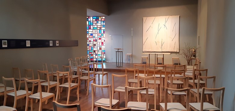 Gleichzeitig ist der Raum zentral akzentuiert: Die Gemeinde versammelt sich um den Altar und um das Wort Gottes. Sie bezeugt ihren Glauben an Jesus, der in der glaubenden Gemeinschaft, im Wort der Schrift und in der Feier der Eucharistie wirksam gegenwärtig ist. Das Hören fordert Veränderung, der Empfang des Leibes und Blutes Jesu stärkt und mahnt zu sozialer Verantwortung.