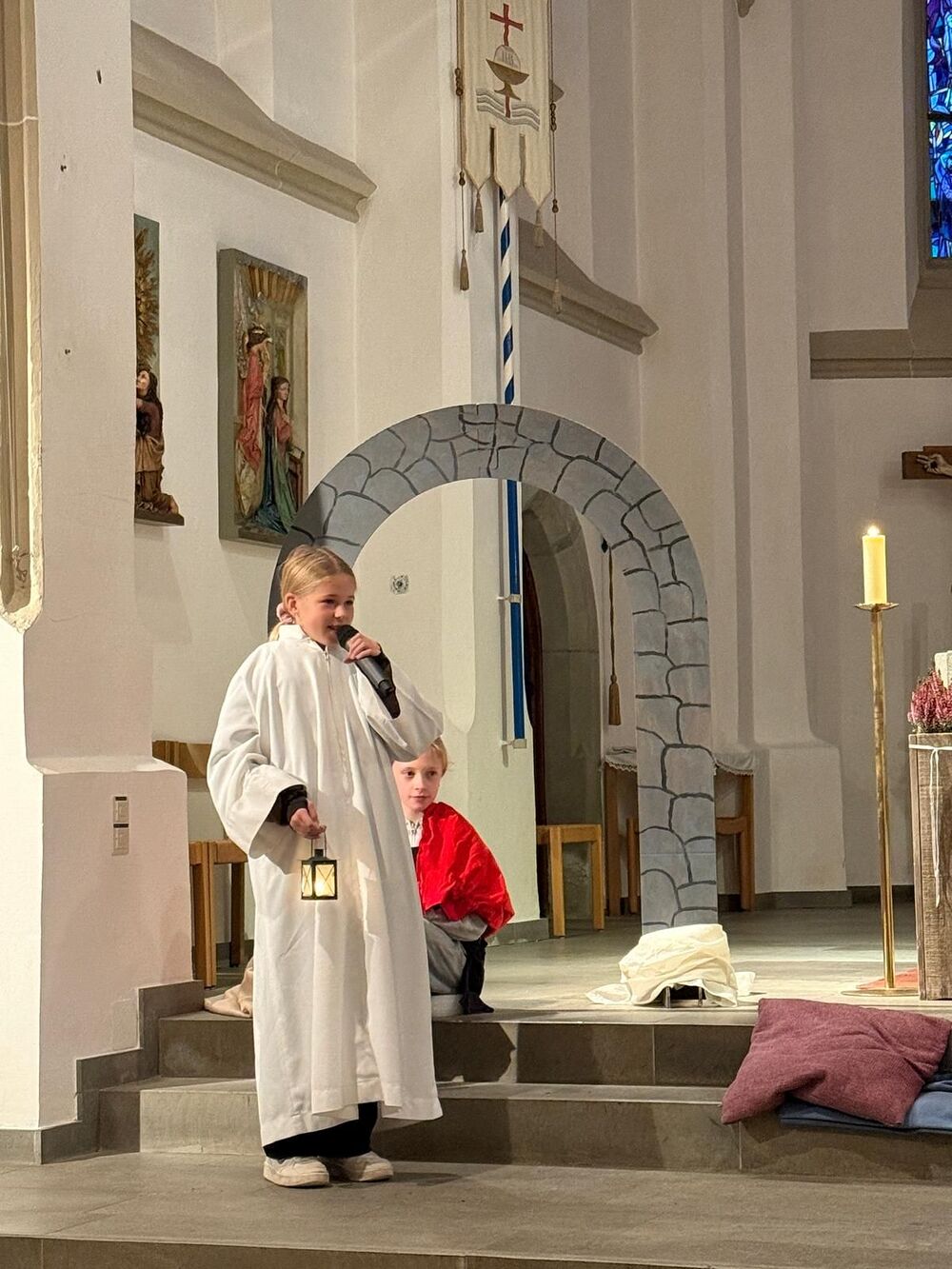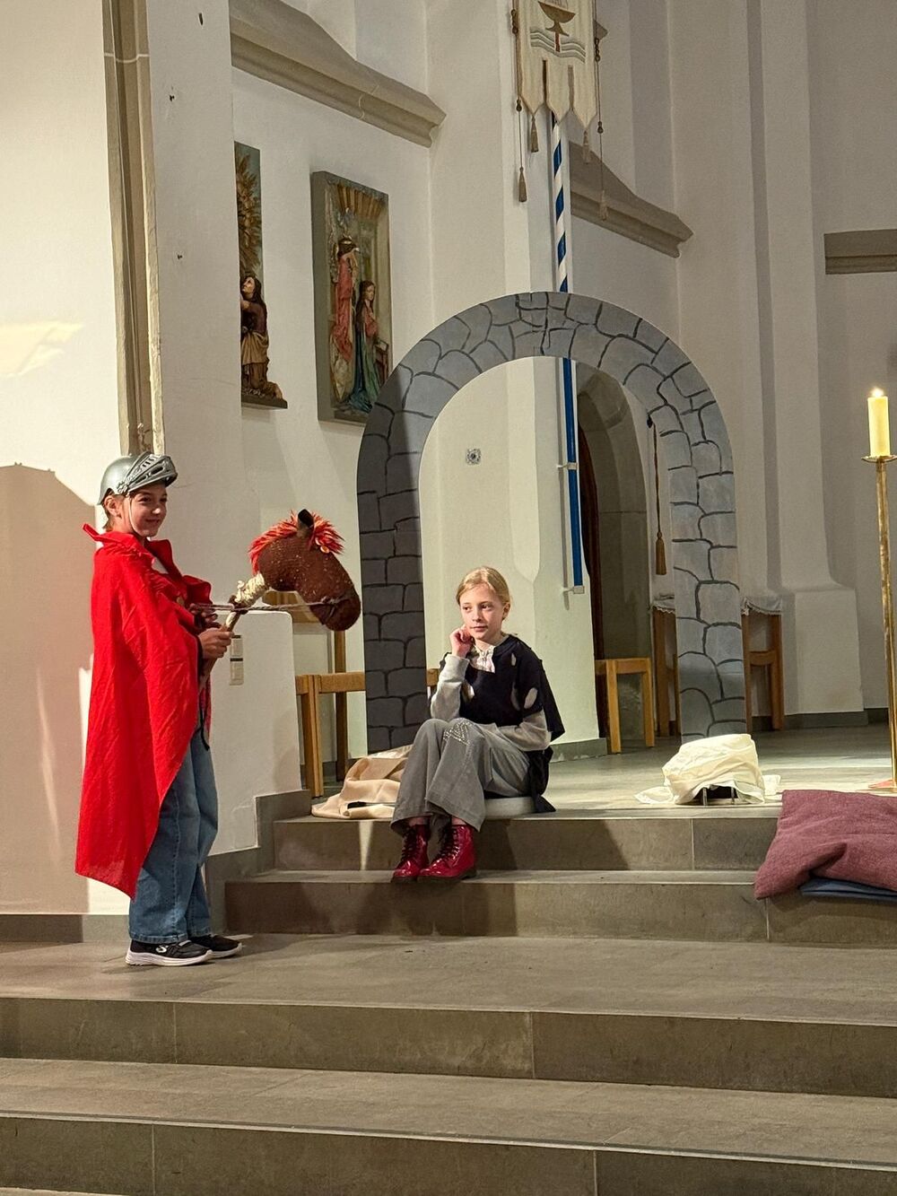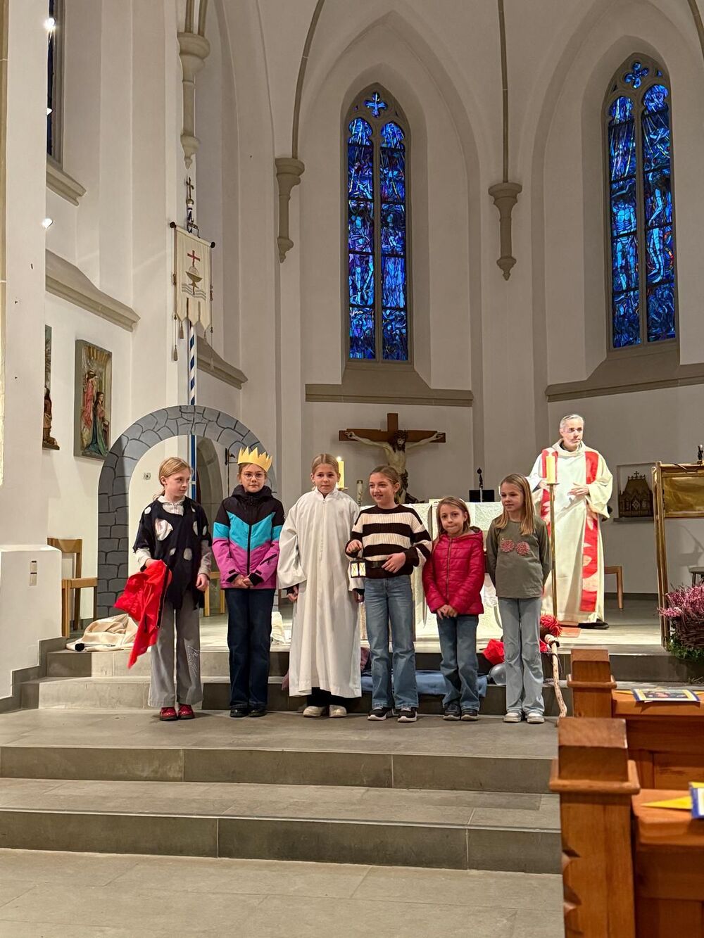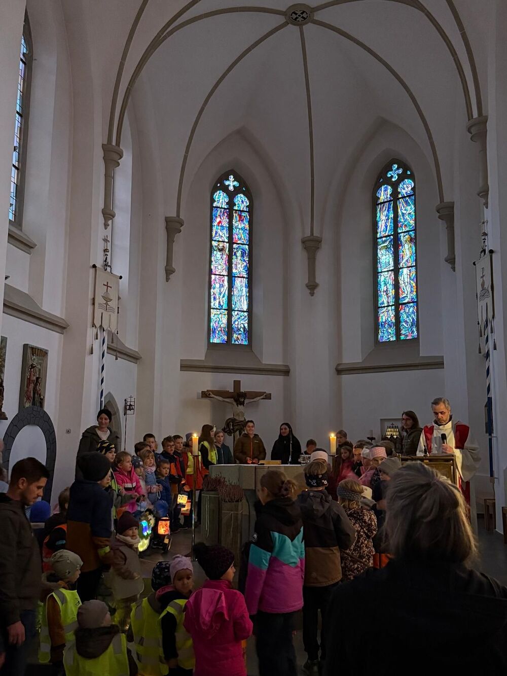 Die Kinder wirkten aktiv beim Gottesdienst mit und verfolgten aufmerksam das kleine Schauspiel zur Legende des heiligen Martin. Als der rote Mantel mit einem Hieb geteilt wurde und dem frierenden Bettler wieder warm wurde, wurde allen spürbar bewusst, was diese Geschichte uns sagen möchte: Martins Tat bleibt ein Vorbild für gelebte Nächstenliebe.