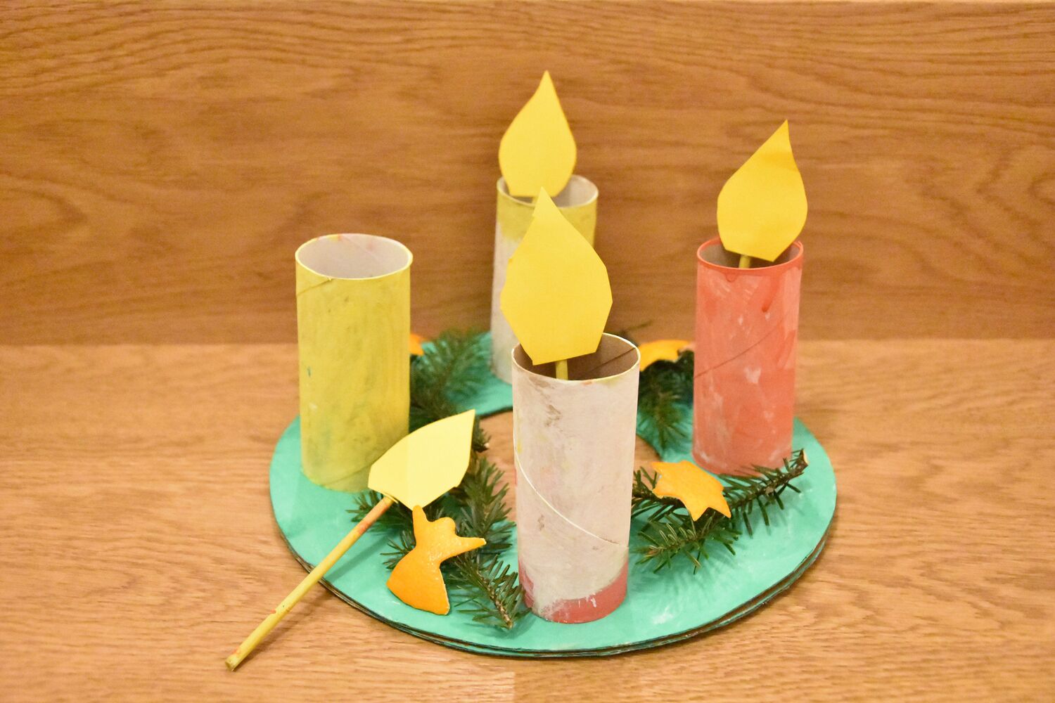 Bei dieser völlig ungefährlichen Alternative, können sich Eltern aber beruhigt zurücklehnen: ein Last-Minute-Adventkranz aus Papier – nachhaltig, sicher und mit Materialien, die sowieso schon zuhause liegen!