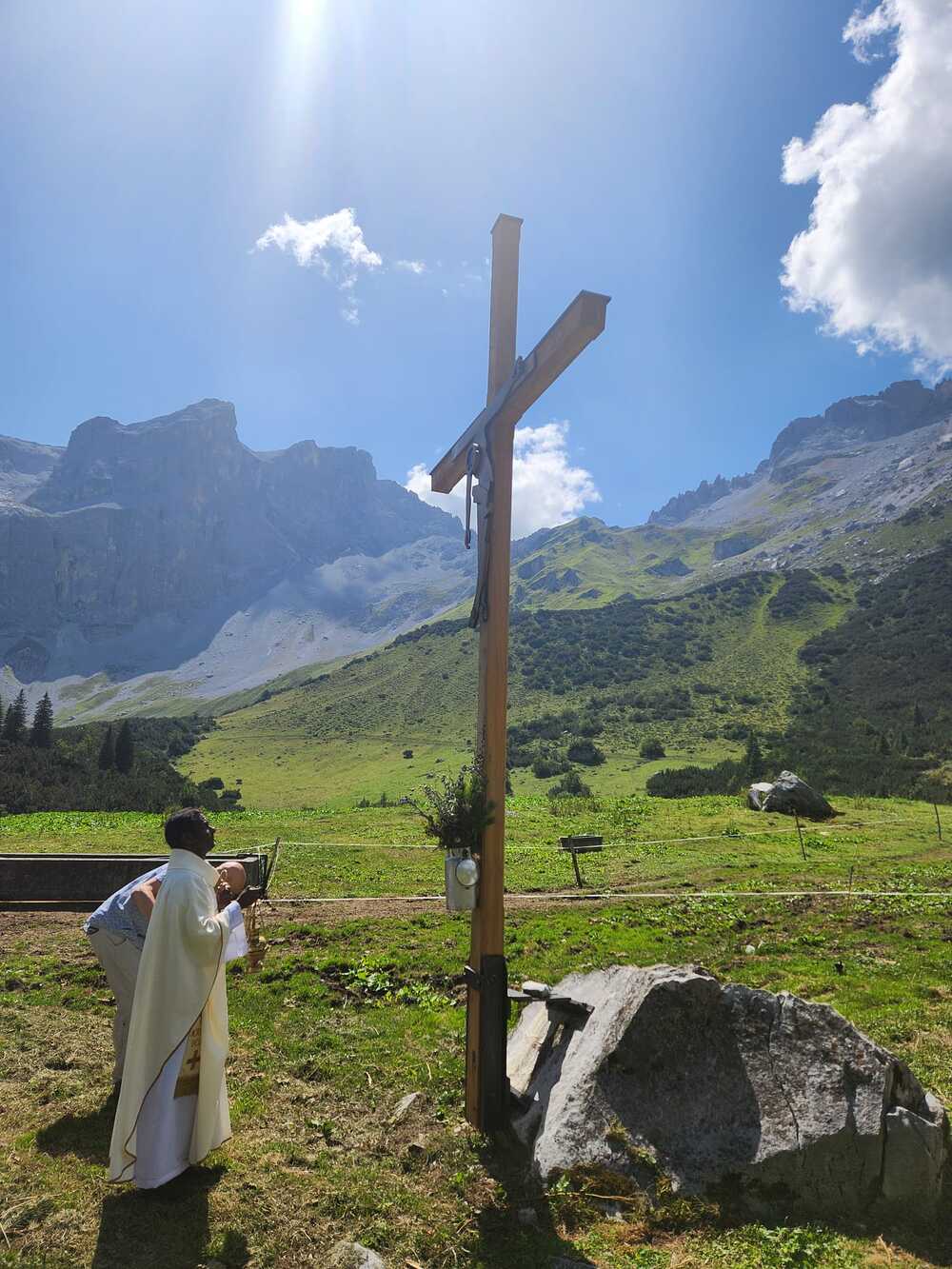 Auf der Alpe Spora in Tschagguns wurde die Alpmesse mit Kaplan Albert am Feiertag, den 15. August 2025, gefeiert. Bei herrlichem Wetter und vielen Besuchern wurde bei diesem Anlass auch das neue Kreuz gesegnet.
