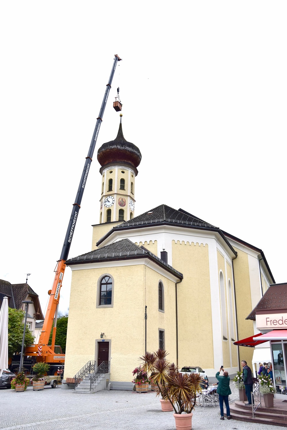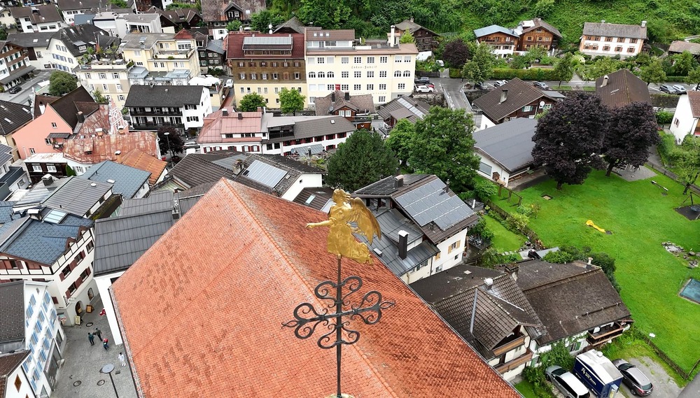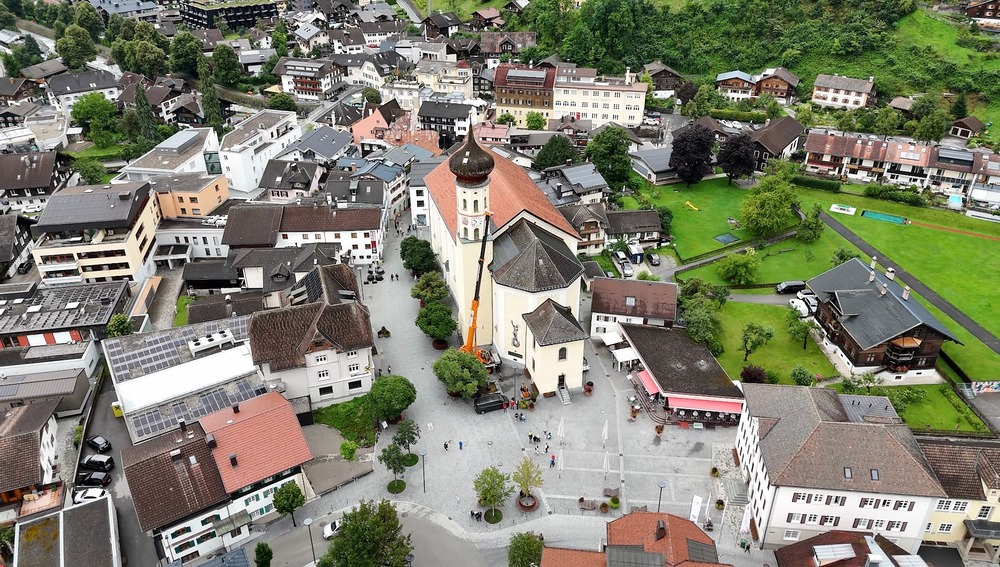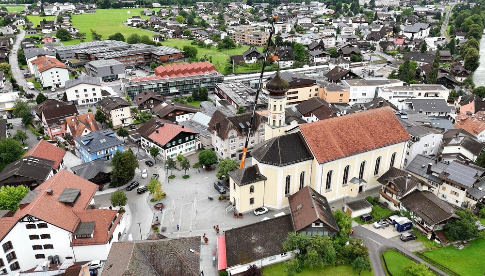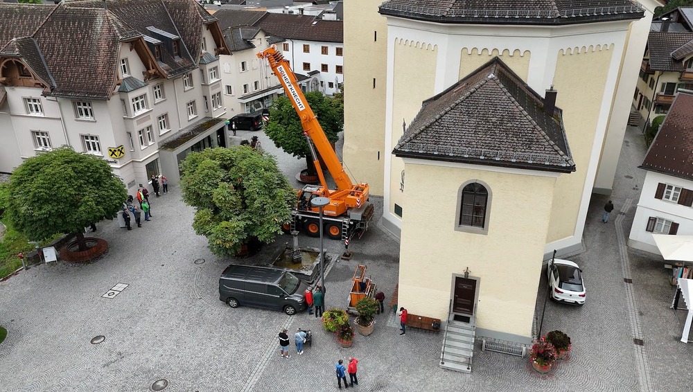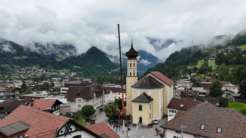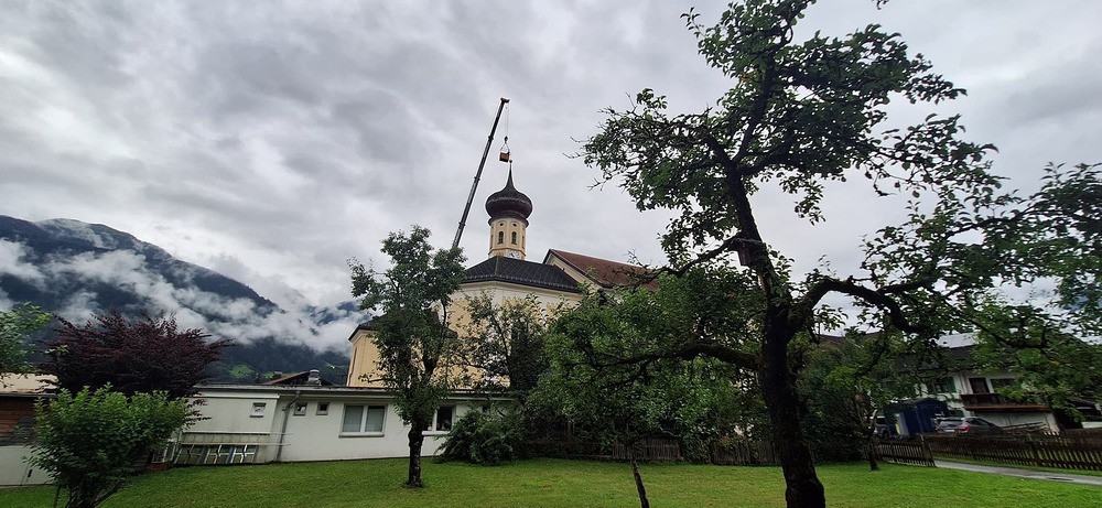 Der Engel auf der Kirchturmspitze des Münsters in Schruns musste abgenommen werden. Einem wachsamen Bürger, der nicht weit vom Münster wohnt, ist aufgefallen, das die Trompete des Engels schief hängt. Um größeren Schaden zu verhindern, musste schnellstmöglich eine "Hilfe" organisiert werden. Aufgrund der Höhe hat ein Kran mittels Korb die Restauratorin zum Engel befördert, der dann in luftiger Höhe abmontiert wurde. Diese Aktion hat auch einige Zuschauer auf dem Kirchplatz zum stehen bleiben und staunen aufgehalten. Ohne Probleme wurde der Engel schlussendlich zu Boden gebracht und konnte so auch von Pfarrer Hans Tinkhauser begutachtet werden, bevor er zur weiteren Abklärung mitgenommen wurde.