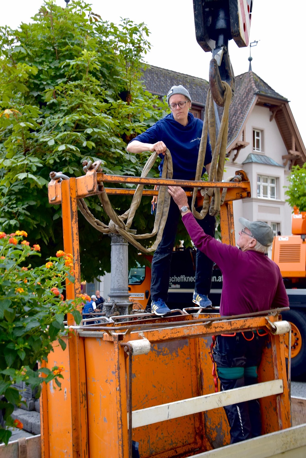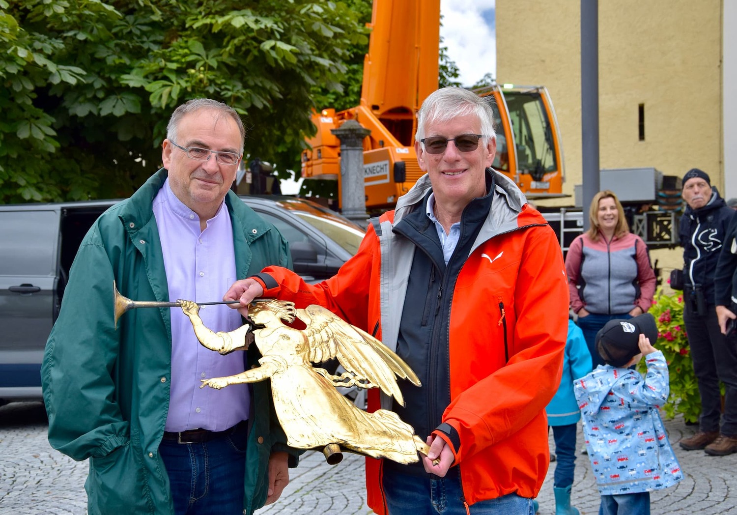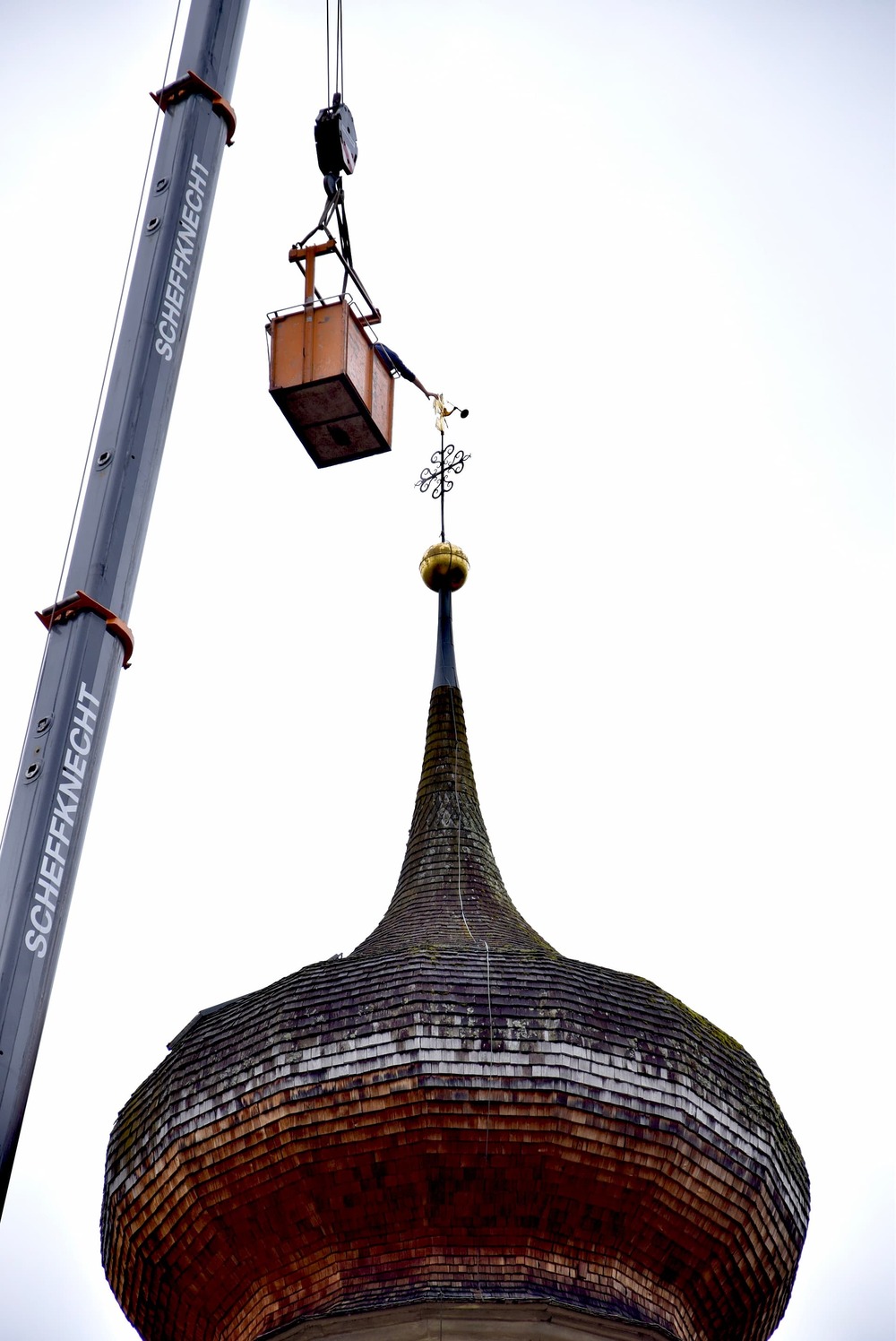 Der Engel auf der Kirchturmspitze des Münsters in Schruns musste abgenommen werden. Einem wachsamen Bürger, der nicht weit vom Münster wohnt, ist aufgefallen, das die Trompete des Engels schief hängt. Um größeren Schaden zu verhindern, musste schnellstmöglich eine "Hilfe" organisiert werden. Aufgrund der Höhe hat ein Kran mittels Korb die Restauratorin zum Engel befördert, der dann in luftiger Höhe abmontiert wurde. Diese Aktion hat auch einige Zuschauer auf dem Kirchplatz zum stehen bleiben und staunen aufgehalten. Ohne Probleme wurde der Engel schlussendlich zu Boden gebracht und konnte so auch von Pfarrer Hans Tinkhauser begutachtet werden, bevor er zur weiteren Abklärung mitgenommen wurde.