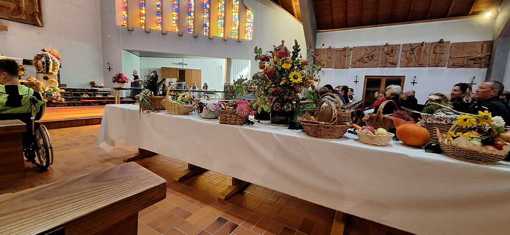 Bei der gut besuchten Messe wurden die vielen mitgebrachten Erntedankkörbe gesegnet. Zum Vater unser hat Pfarrer Hans die vielen Kinder zum Altar gebeten und der Kirchenchor Vandans hat den Gottesdienst musikalisch mitgestaltet. Die Kirche wurde vom Obst- und Gartenbauverein festlich geschmückt und hat anschließend an die Messe bei herrlichem Wetter zur Agapé mit Wein, Süßmost und süßem sowie pikantem Gebäck auf dem Kirchplatz eingeladen.