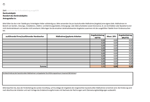 Vorlage Förderantrag Baukulturelles Erbe Land Vorarlberg Excel als PDF